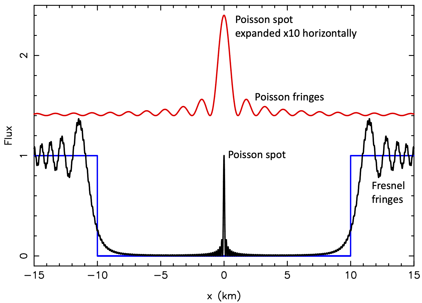 The calculations describing the flash involve path integrals and use Sommerfeld’s lemma, which is essential in quantum mechanics. A logical situation : photons are, by definition, quantum objects ! From there, the authors consider several scenarios, starting with a spherical occulter without an atmosphere and of radius R0, and a star assumed to be point-like. This yields the classical Poisson spot, whose maximum irradiance is equal to that received from the star outside the shadow. The Poisson spot is described by the square of the Bessel function of the first kind and zero order, J0. It is an oscillating function that reaches unity at the center of the shadow and has a width close to λ∆/(2R0), where λ is the observation wavelength and ∆ is the geocentric distance of the occulting body. This peak is also surrounded by fringes, equally spaced at approximately λ∆/(2R0).