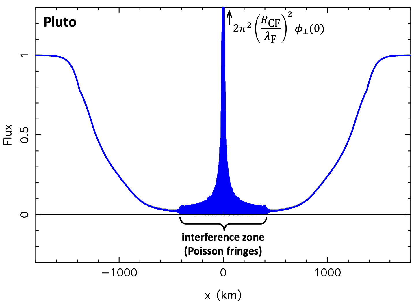 That said, other effects must be taken into account to describe the flash. For example, the size of the occulted star is finite. When projected onto the occulting plane, this size is typically on the order of a kilometer. This implies that diffraction effects are smoothed by the stellar diameter : in the case of a thin atmosphere, the height of the central flash is then less than (R0/r0)² ; in the case of a dense atmosphere like Pluto’s current one, calculations show that despite this smoothing, the flash can still reach heights more than 50 times the star’s initial signal. Another effect to consider is the possible distortion of the atmosphere relative to the spherical model. In this case, the Poisson spot is replaced by a caustic surrounded by fringes, a topic for future study…