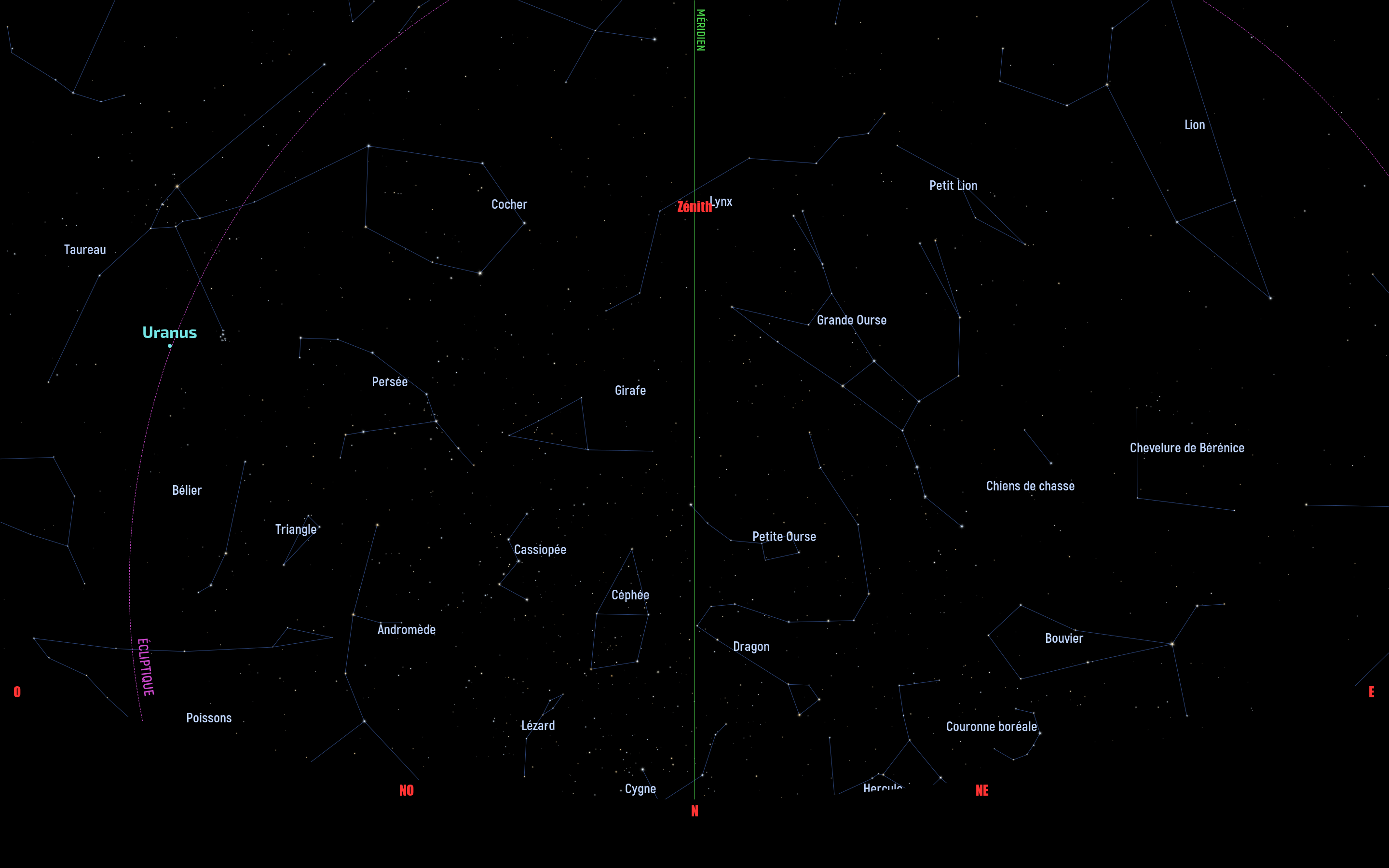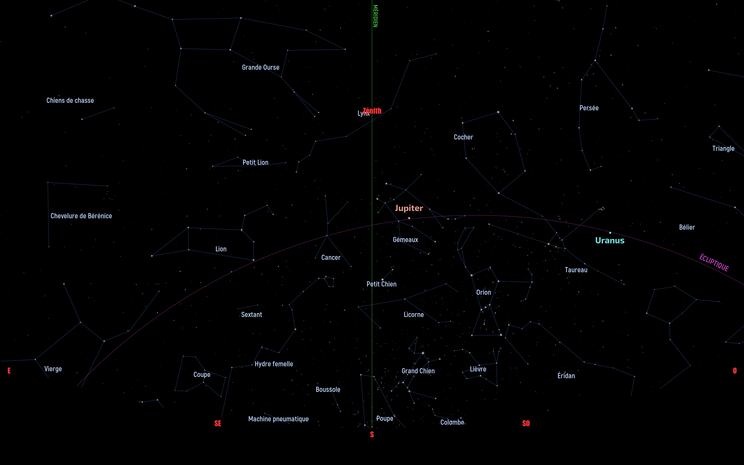 Cartes du ciel des étoiles brillantes et des planètes visibles dans le ciel de l’hémisphère nord, vers l’horizon nord et l’horizon sud, pour le 15 février 2026.