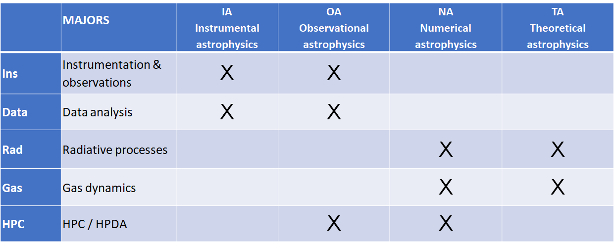 Les master classes sont associées aux majeures comme indiqué dans le tableau ci-dessous.