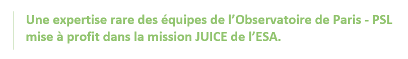 ◼ Au sein du Laboratoire d’études spatiales et d’instrumentation en astrophysique (LESIA), nos chercheurs sont intervenus bien en amont de la mission, dès 2010, en tant que membres de la Science Study Team, le groupe qui, à l’origine, a développé la proposition de la mission, puis porté Juice aux différentes étapes de sa sélection, jusqu’à son adoption définitive au sein de l’ESA en 2012.