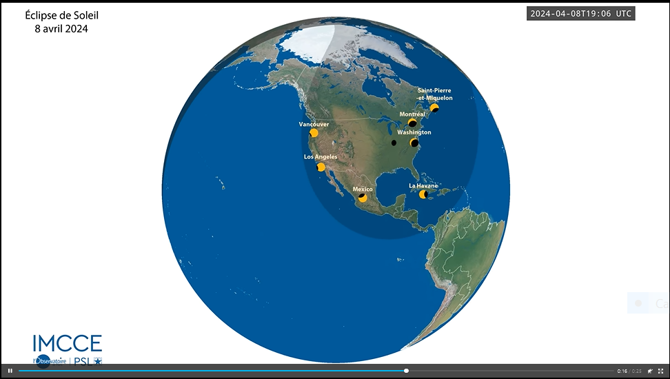 Si la durée maximale de la centralité est de 4min34s, cette durée n’est pas la même tout le long de la bande de centralité. Elle va décroître à mesure que l’on s’éloigne du lieu de ce maximum, situé au cœur du Mexique. Par exemple au large de Saint-Pierre-et-Miquelon, elle ne sera plus que de 3min.