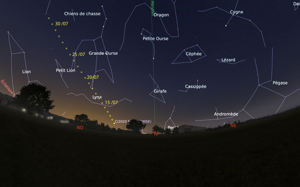 Neowise est en ce moment visible dans la nuit entre quatre et cinq heures du matin, en direction du nord-est, dans la constellation du Cocher, à une dizaine de degré au-dessus de l’horizon. Elle est en train de se déplacer en direction de la Grande Ourse.