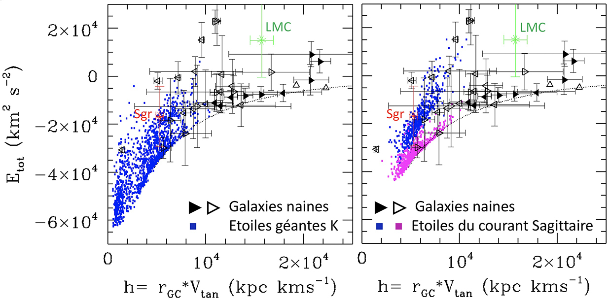 Il est admis que tous les objets qui gravitent au voisinage de la Voie Lactée - étoiles géantes, amas globulaires et galaxies naines -, ont des énergies et moments angulaires (rotationnels) qui décroissent avec le temps. Ils subissent en effet des pertes d’énergie dues à des effets de marée ou au gré de rencontres avec d’autres objets. En d’autres termes, plus ils sont en orbite sur de longues périodes, plus leurs énergies et moments angulaires diminuent en intensité.