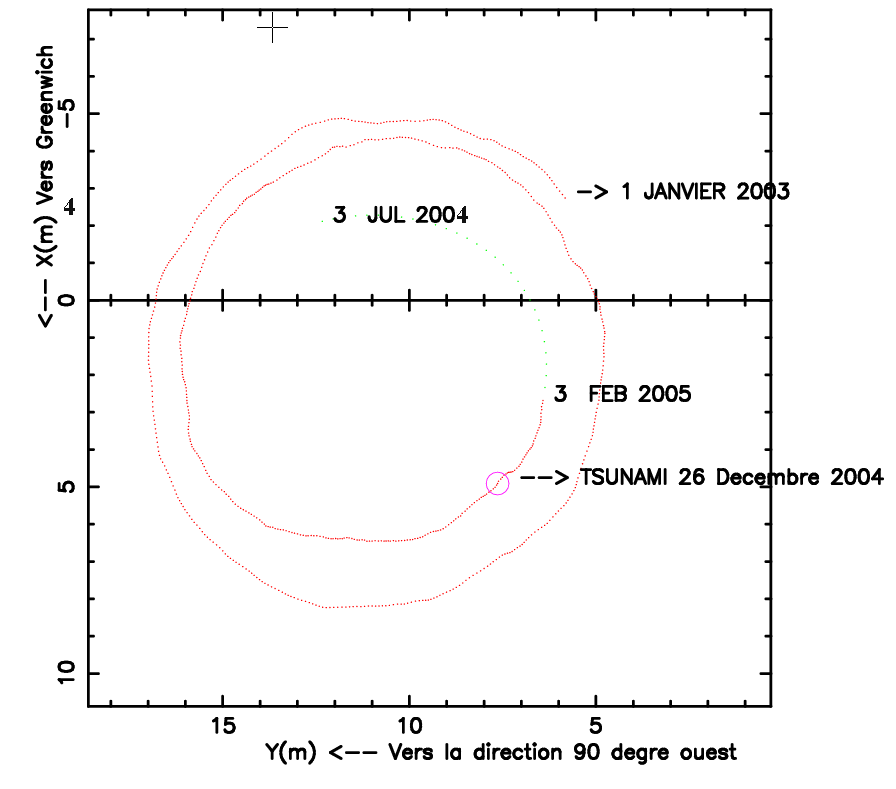 Le Centre de la Rotation de la Terre du Service International de la Rotation de la Terre et des Systèmes de référence (IERS) à l’Observatoire de Paris a notamment pour mission de faire le suivi en temps quasi-réel des variations du mouvement de la terre en utilisant les observations issues de diverses techniques spatiales comme le GPS, l’interférométrie sur radio-sources extra-galactiques ainsi que la télémétrie laser sur satellites et sur la Lune. Les analyses fines des variations observées dans la "polhodie" (voir figure 1) n’ont à ce jour pas montré d’effet discernable.