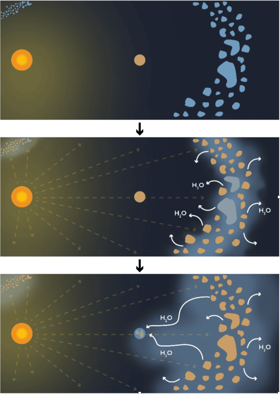 Jusqu’à présent, la théorie dominante supposait que des corps glacés, similaires à des comètes, avaient percuté la Terre, apportant ainsi l’eau. Cependant, ce scénario nécessite un "jeu de billard" cosmique, où des mécanismes dynamiques complexes envoient ces objets glacés vers la Terre, à un moment précis et en quantité suffisante. Pour le moins aléatoire, ce scénario est questionné quant à sa robustesse, et sur son universalité à travers tous les systèmes extrasolaires.